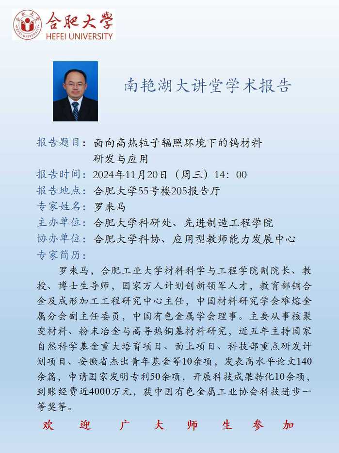 【南艳湖大讲堂】面向高热粒子辐照环境下的钨材料研发与应用