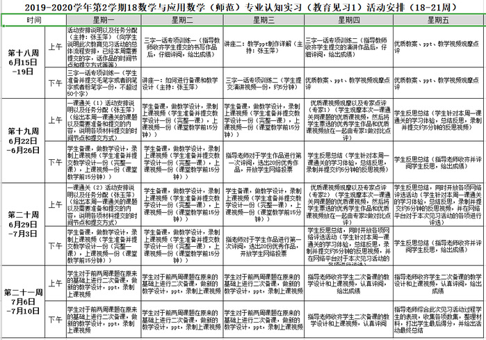 受教育研习成功经验的鼓舞,数学与统计系再接再厉,在教务处和人工智能与大数据学院领导的关心和支持下,在数学与统计系王磊主任的带领下,秉承“学生中心、产出导向”的原则,经过反复调研,积极筹备,为2018级数学专业74名师范生量身制定了为其四周的线上教育见习实训(6月15日-7月10日)。此次活动形式创新、内容丰富,包括“线上书写比赛”“线上演讲比赛”“一周一课、课课通关”“专家课例点评”“教研见习反思”“第十一届安徽省师范生技能大赛十强集训”等系列活动。在教育见习过程中,邀请了合肥一中刘娟、胡媛媛,合肥六中徐小松,合肥一六八中学黄小娟、张玉萍等知名中学的5位一线教师和合肥市教育局的许晓天、张永超等数学教研员。他们充分参与了学生教学视频的观摩与评改,专业的线上教学评价讲座等活动,充分践行了《中学教育专业认证》中强调的“高校,地方政府,中学”三位一体、协同育人的新形式。