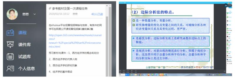 为了弥补线上教学开展互动不足,解决学生课堂吸收知识效果可能不如线下教学的问题,通过在线上平台选择优秀MOOC教学资源鼓励学生自主学习。通过查找资料就三门课程分别向学生推荐了自建MOOC课程“微观经济分析”(e会学)、“国际金融”、“资产评估学”(中国大学MOOC)。