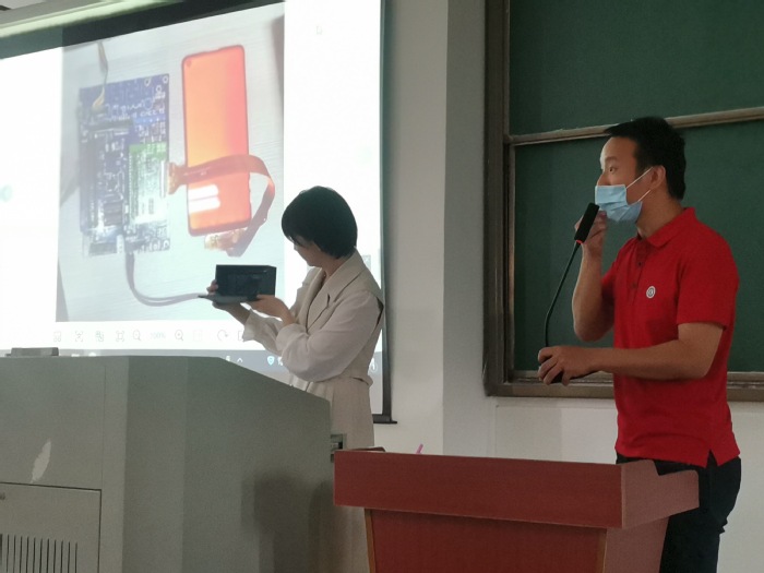 李炎阳现场展示了设计作品的原型。他指出,本次专项赛作品征集主题为“液晶显示模组展示装置造型设计”,主要针对手机屏幕和平板电脑屏幕两款液晶显示模板组DEMO的展示设计作品征集。目前展品载体材质单一、形式单一,希望参赛者发挥专业所学,进行头脑风暴,设计出更新颖、更具科技感、智能化的产品。他建议参赛者要紧密围绕专项赛主题,秉承着“创意性、引领性、实用性兼顾市场推广价值”的理念进行作品设计。活动中,李炎阳还与主持人一同解答了在场师生的提问。
