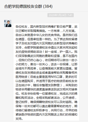 新型冠状病毒的爆发牵动着全国人民的心弦,我校在德校友们都在时刻关注着国内疫情的变化,同时在微信群里纷纷表达了希望为国内奋战在武汉抗击病毒前线的医护人员和机构贡献一份力量的意愿。在我校驻德代表孙建安的倡导下,合肥学院德国校友会作为我校众多留德校友的联络平台,同时也是在德华人规模较大的注册机构之一,于第一时间通过微信群、QQ群及短信等形式发布了募捐公告,为广大校友奉献爱心搭建了公开、公正、高效的渠道。