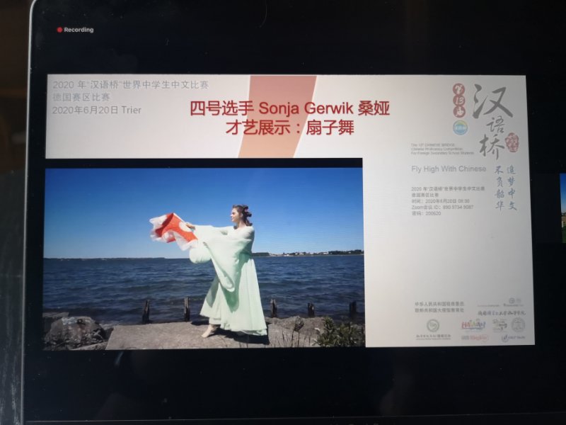 德国时间6月20日,由中国驻德国大使馆主办、特里尔大学孔子学院承办的2020年第13届“汉语桥”世界中学生中文比赛德国赛区决赛落下帷幕。受新冠肺炎疫情影响,本届比赛首次采用了视频会议的形式。13名来自德国不同城市的中学生围绕“追梦中文,不负韶华”的主题通过中文演讲、知识问答和才艺展示等环节展现自己对中国文化的热爱。