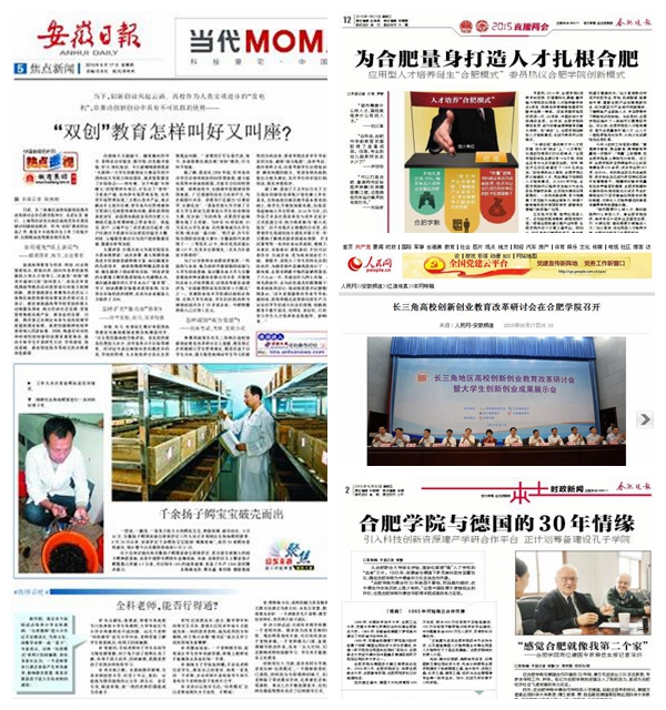 五年来,校外平面媒体共刊发我校报道600余篇,其中人民日报、光明日报、中国日报、中国教育报、中国青年报、中央电视台、安徽日报、安徽电视台等中央和省级重要媒体以及法新社、德国国家电视台等报道我校130多次,新华网、人民网等网络媒体刊发报道180多条,安徽教育网1170余条,其中首页270多条。人民日报《中德联手,这样培养应用型人才》、中国教育报头版《一所地方高校的转型突围》、中国青年报《“小学校”也有“大创意”》、新华网《中国高校改革人才培养模式加速青年创新创业》、中国教育报《特色培养让专业硕士“接地气”》等引起社会积极反响。(宣传部)